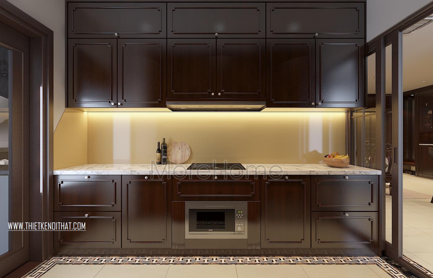 Một bên tủ bếp gỗ được thiết kế làm khu vực nóng, bếp điện, lò nướng và hệ thống tủ để đồ