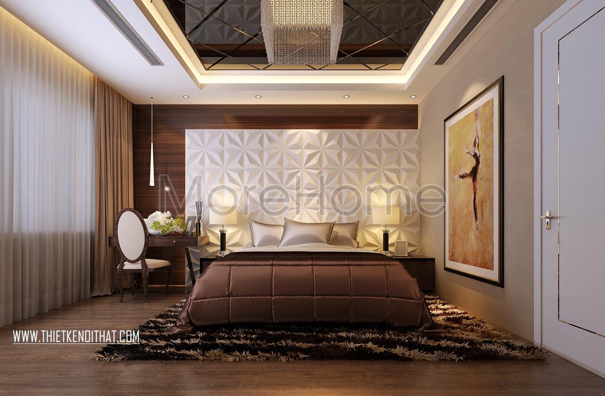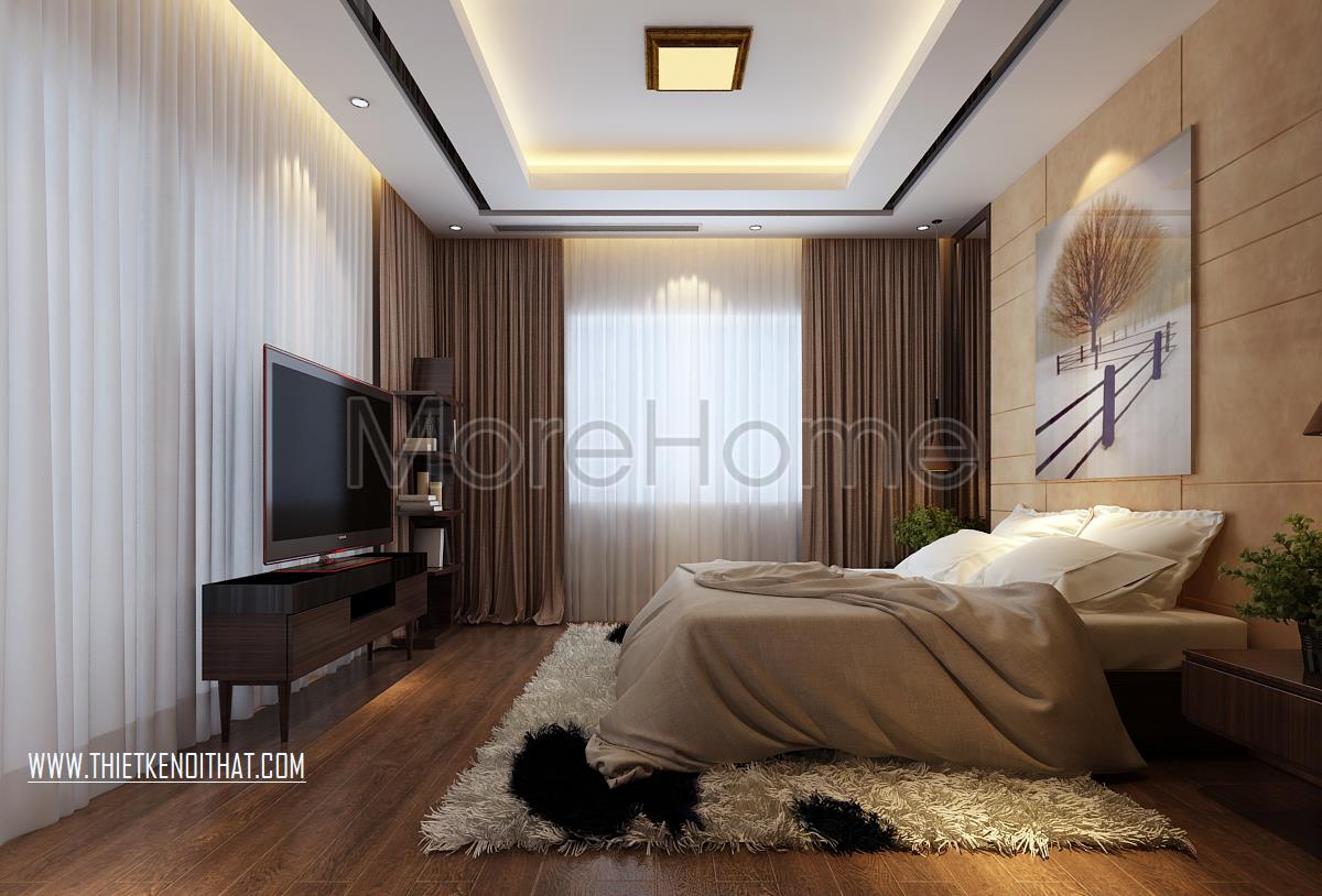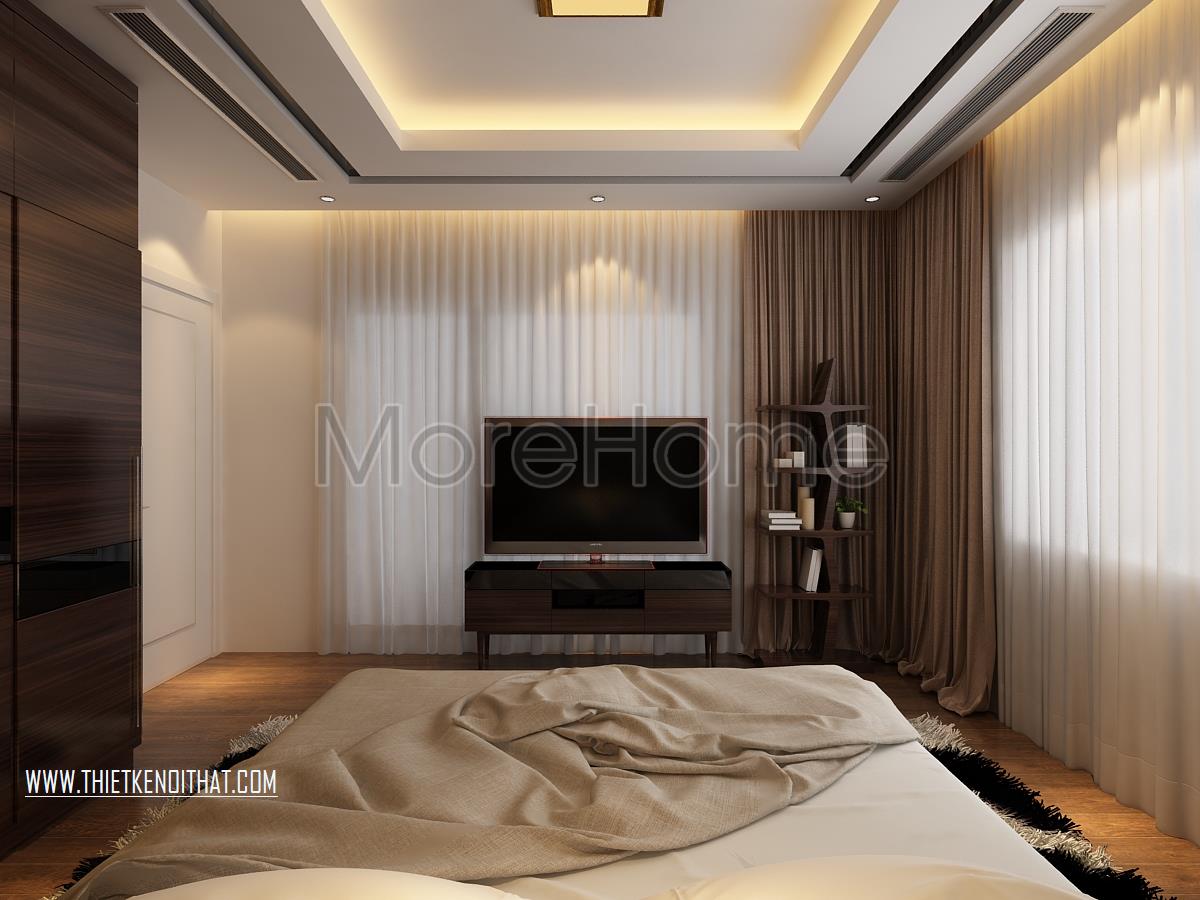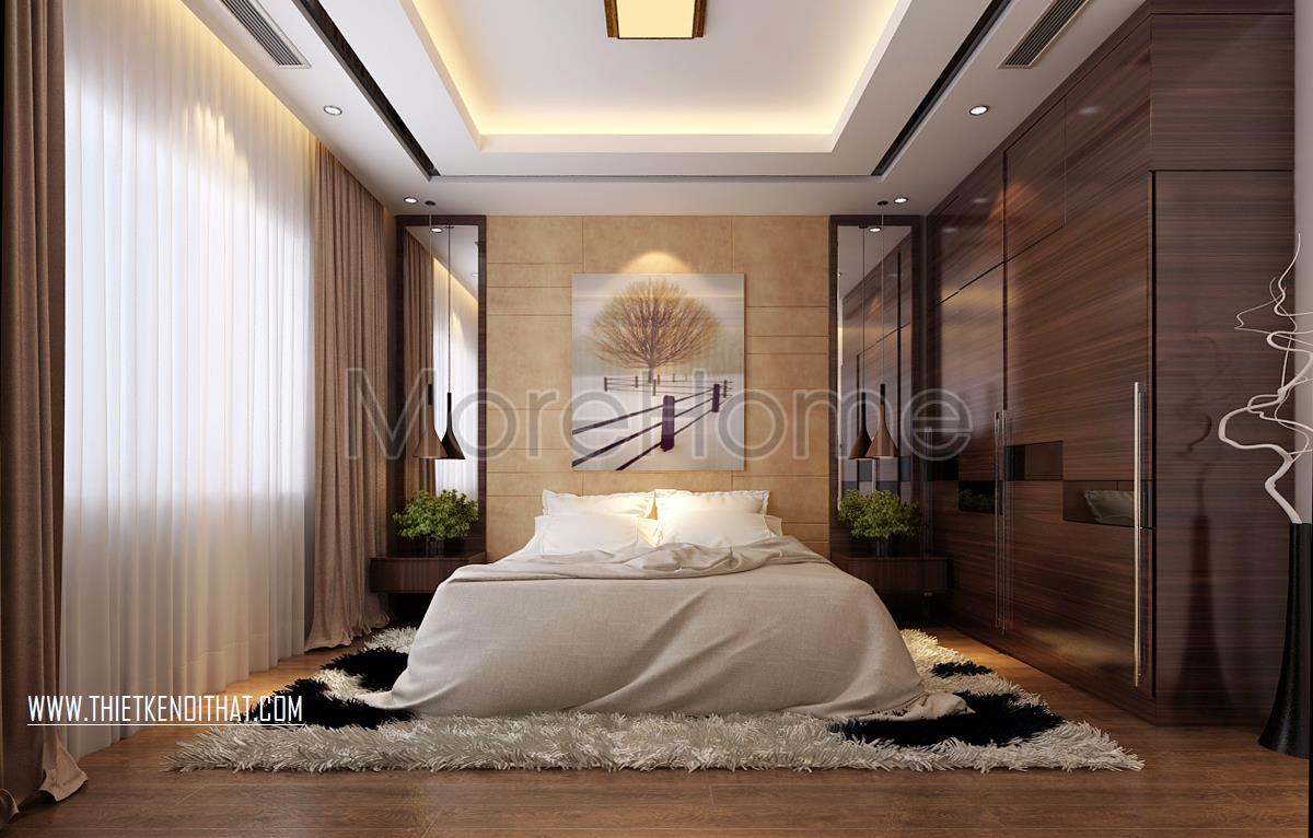 Thiết kế nội thất phòng ngủ hiện đại sử dụng các hình khối đơn giản, không quá đi sâu vào các chi tiết cầu kỳ mang đến sự trẻ trung và linh hoạt. Các thiết kế tủ kệ được kiến trúc sư bố trí hợp lý ở các góc phòng, không nặng về kiểu cách, chỉ sử dụng các thanh ngăn nhẹ nhàng giúp mang đến sự tiện nghi cần thiết cho gia chủ.