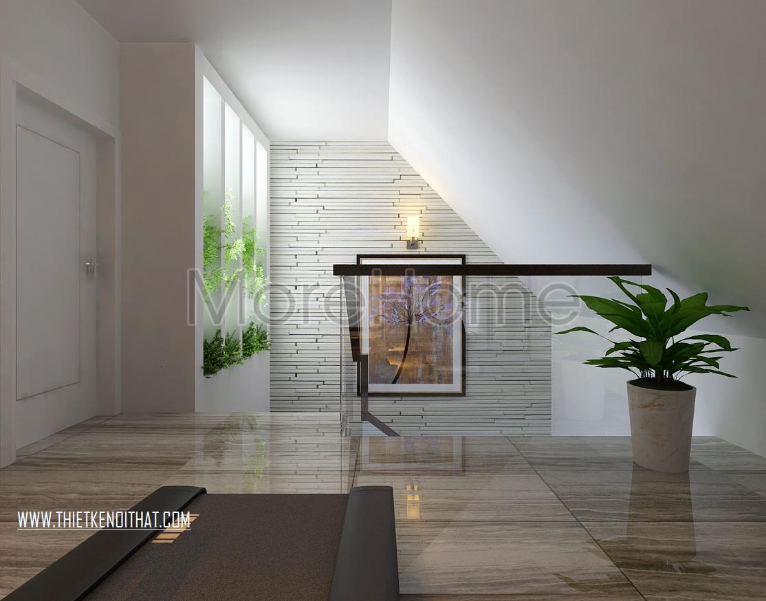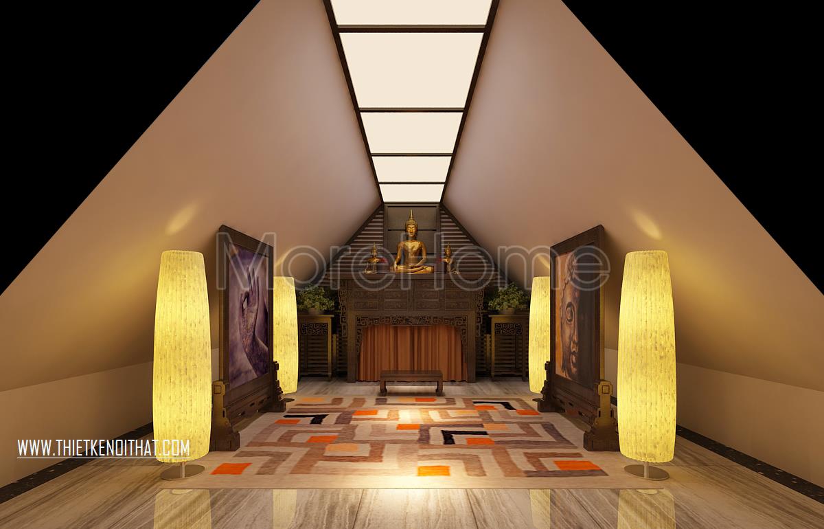 Cuối cùng là thiết kế khu tâm linh. Thiết kế nằm gọn trong một góc nhỏ tầng trên cùng của căn nhà. Nhìn vào không gian thiết kế này, chúng ta có thể dễ dàng cảm nhận được sự linh thiêng và trang trọng cũng như tâm trí của gia chủ vào thiết kế và bố trí không gian. Ánh sáng và màu sắc được điều tiết hài hòa tạo sự cân bằng cho không gian. Bên cạnh đó, thiết kế đối xứng cũng tạo sự đồng nhất và thể hiện rõ dụng ý của gia chủ.