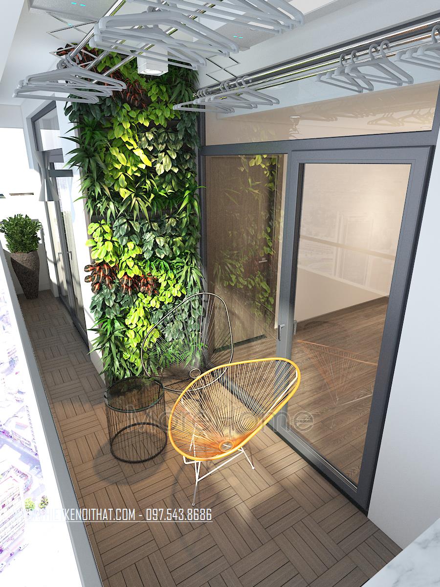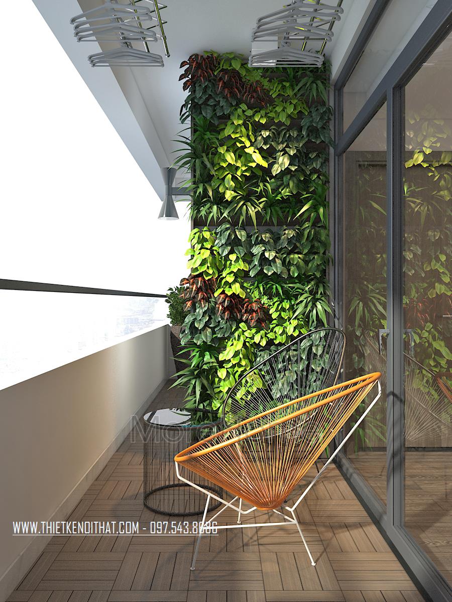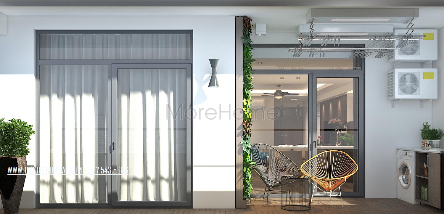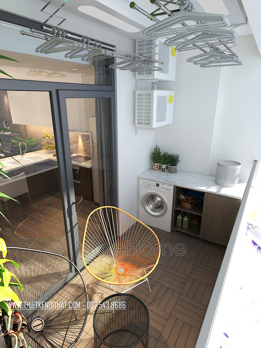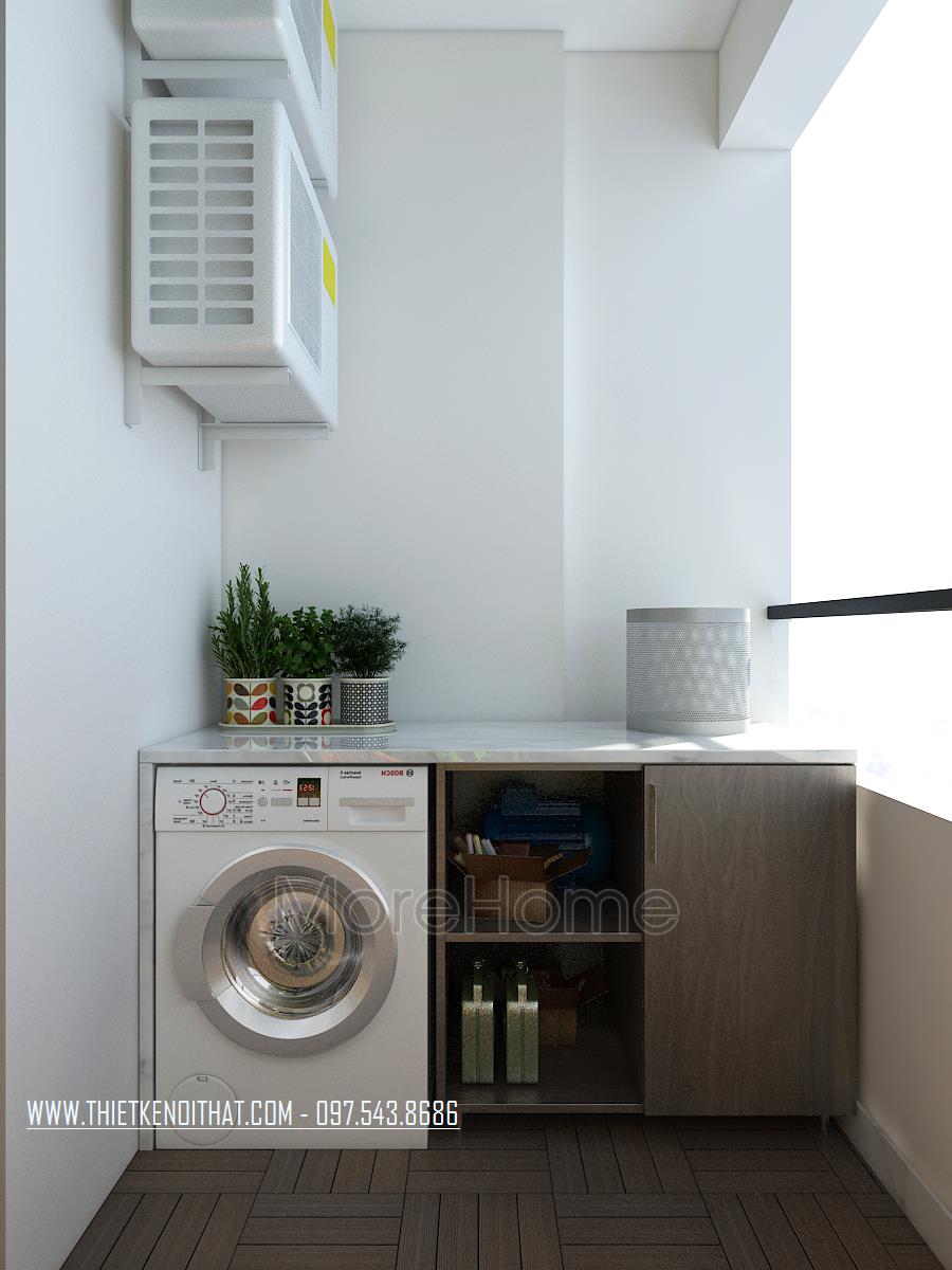 Tiếp đến là thiết kế ban công. Thay vì sử dụng nhà kho hay nhà tắm kết hợp với khu giặt giũ, kiến trúc sư đã khéo léo di chuyển không gian này ra phía ban công. Tuy nhiên một điểm bất lợi của thiết kế nơi ban công chính là việc bảo quản máy móc. Để khắc phục nhược điểm này, kiến trúc sư đã khéo léo sử dụng một khung đá vuông vắn bao quanh tủ kệ và máy giặt như một không gian khép nhỏ giúp bảo vệ máy giặt bền, hiệu quả trong sử dụng.