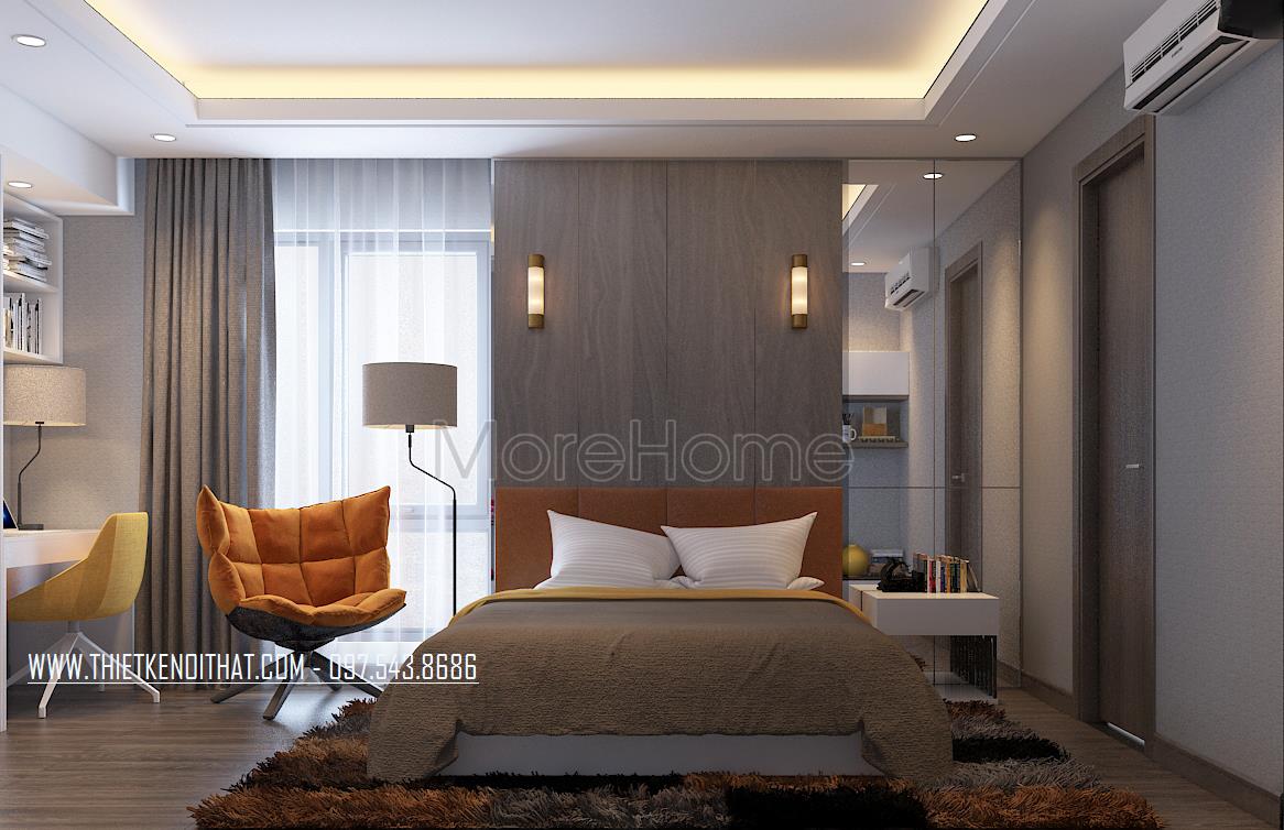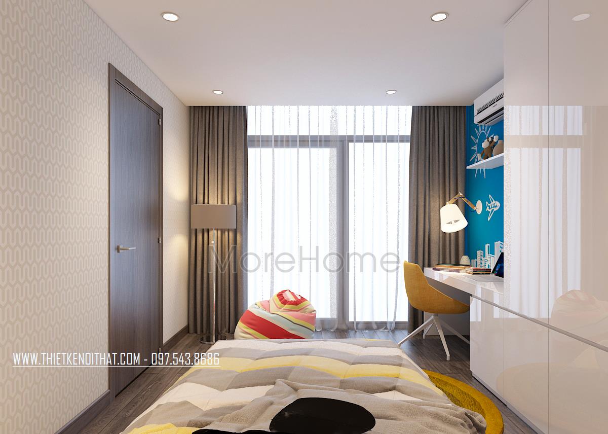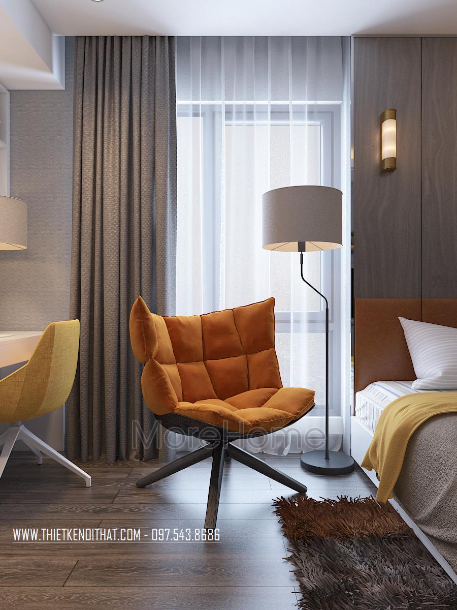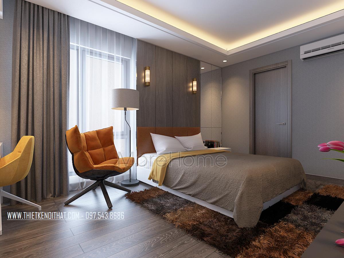 Thiết kế nội thất phòng ngủ với bức tường kính lớn mang ánh sáng tràn ngập căn phòng giúp mang lại hứng khởi cho không gian sống. Các thiết kế tủ kệ đơn giản sử dụng các thanh ngang là chủ yếu giúp không gian được thoáng và tiện nghi hơn hẳn. Bên cạnh đó, yếu tố về màu sắc cũng là một trong những điểm nhấn phù hợp với từng cá nhân và sở thích của từng thành viên trong gia đình.