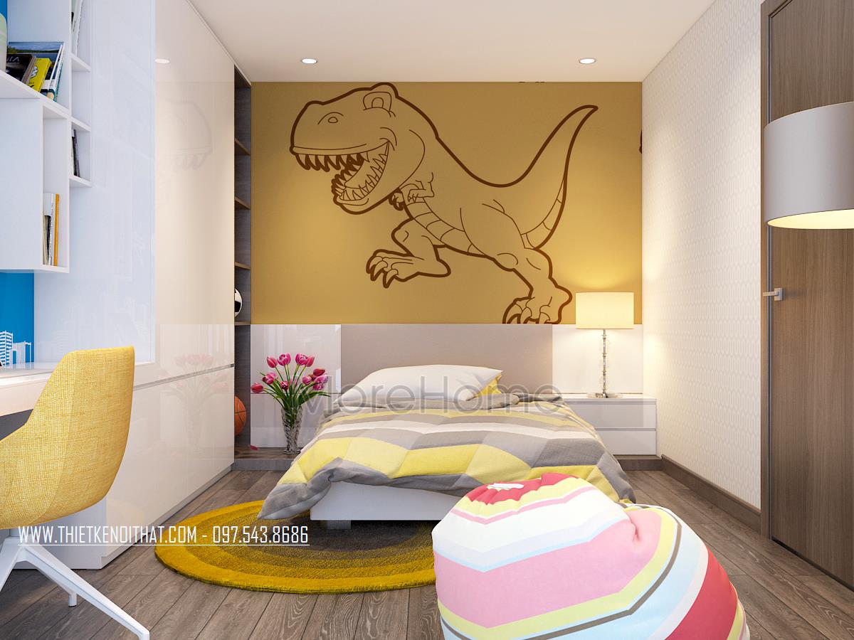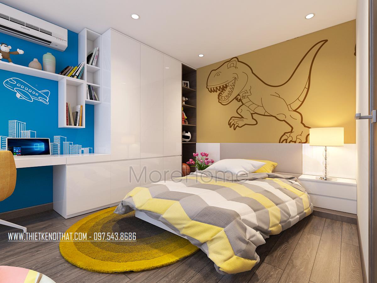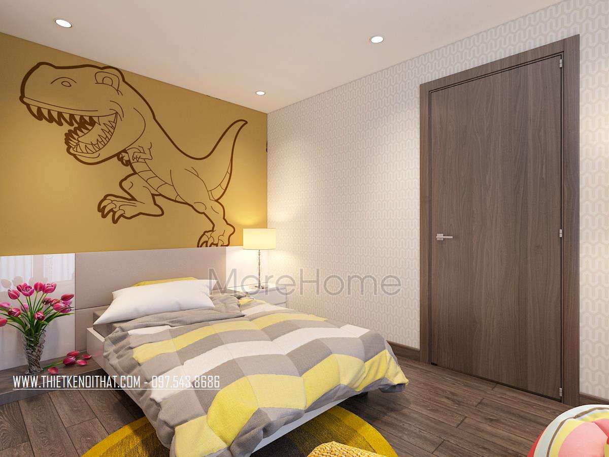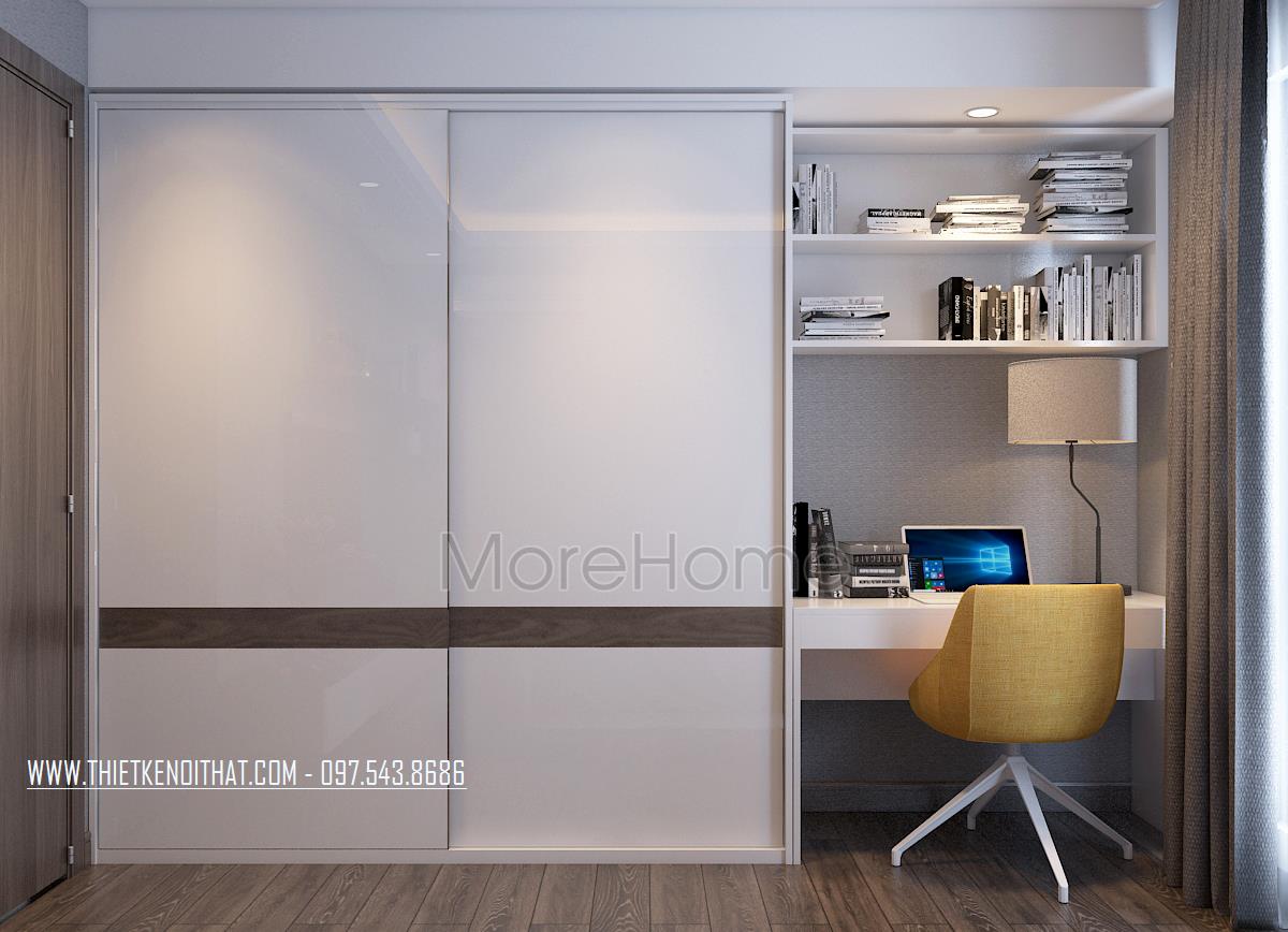 Thiết kế nội thất phòng ngủ với bức tường kính lớn mang ánh sáng tràn ngập căn phòng giúp mang lại hứng khởi cho không gian sống. Các thiết kế tủ kệ đơn giản sử dụng các thanh ngang là chủ yếu giúp không gian được thoáng và tiện nghi hơn hẳn. Bên cạnh đó, yếu tố về màu sắc cũng là một trong những điểm nhấn phù hợp với từng cá nhân và sở thích của từng thành viên trong gia đình.