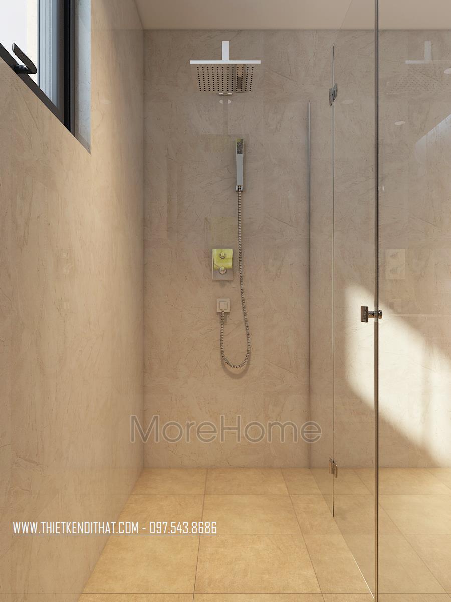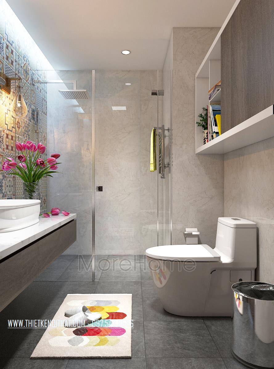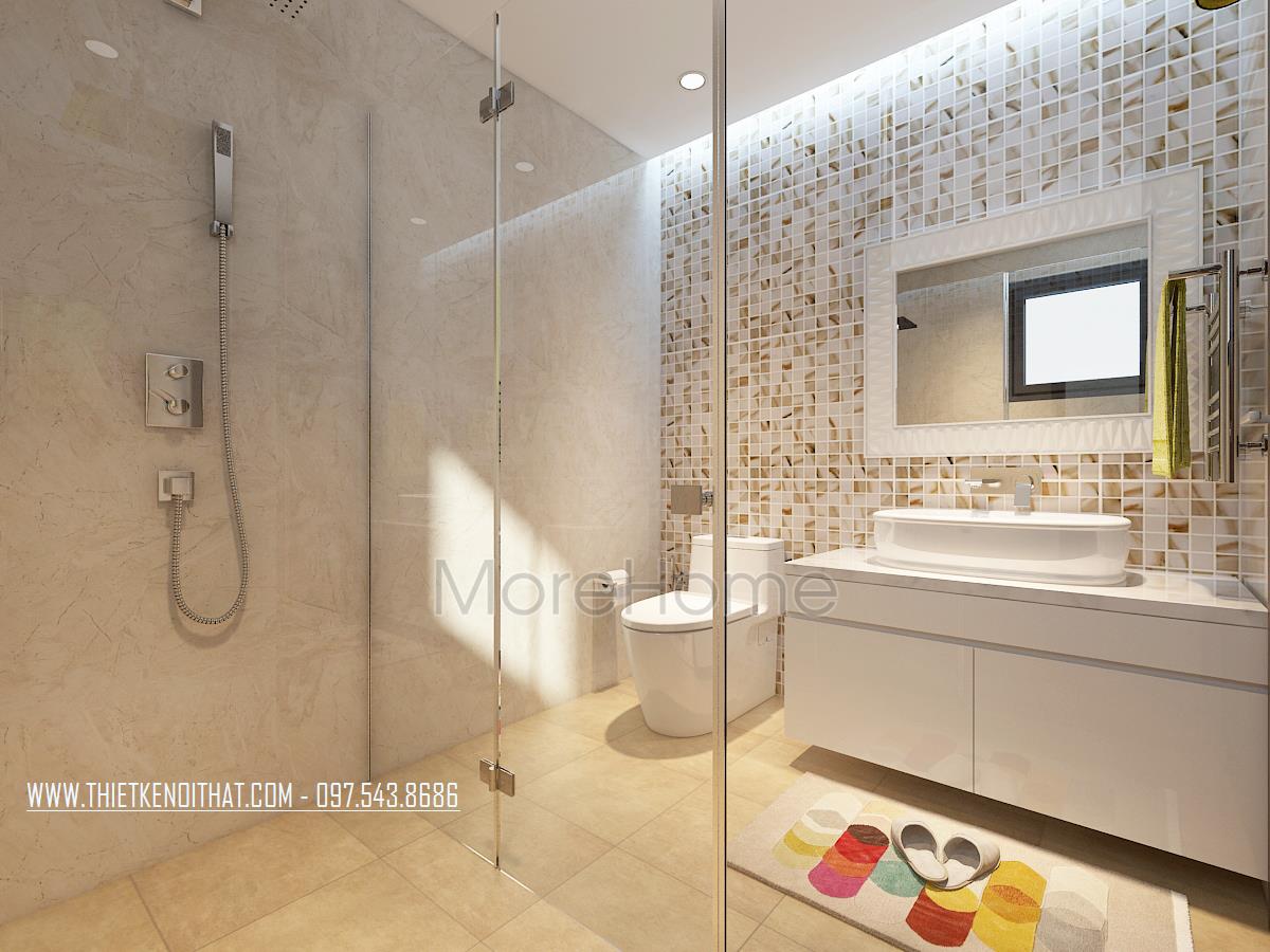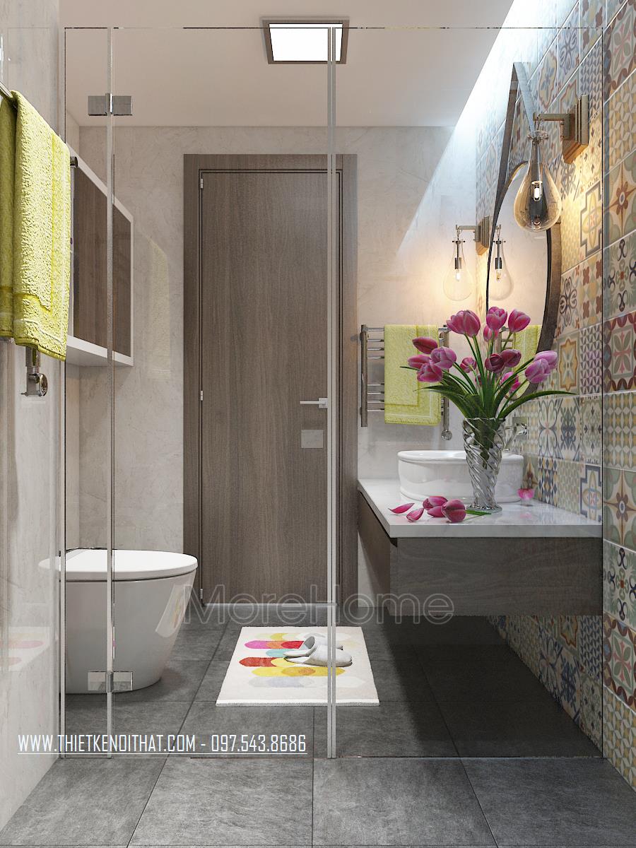 Cuối cùng là thiết kế nội thất nhà vệ sinh hiện đại. Gương và kính cường lực là các vật dụng nhẹ chủ yếu được kiến trúc sư tận dụng sử dụng trong căn phòng nhỏ này. Diện tích không quá rộng vì vậy các thiết kế cũng trong suốt từ đó tạo độ mở cho không gian và mang lại cảm giác cơi nới cho căn phòng hẹp. Tuy nhiên đá tự nhiên chưa đủ để tạo điểm nhấn, các tấm gạch nung với hoa văn ấn tượng được chính kiến trúc sư lựa chọn giúp mang lại cân bằng và kiểu cách cho không gian.