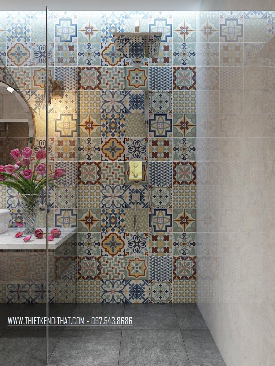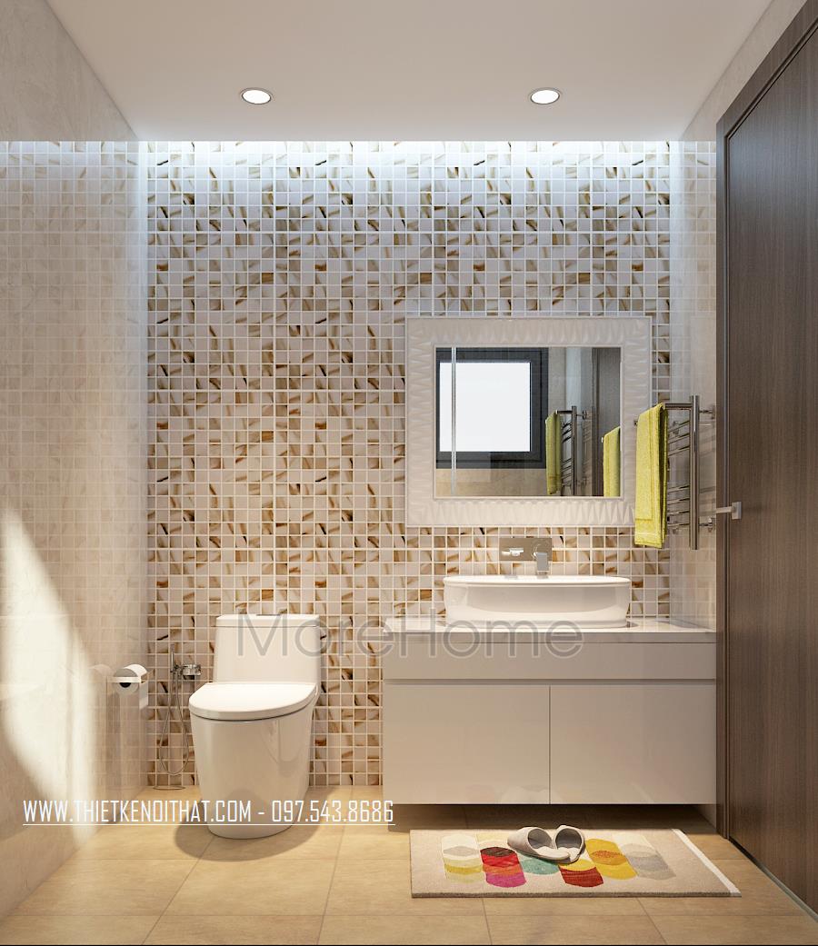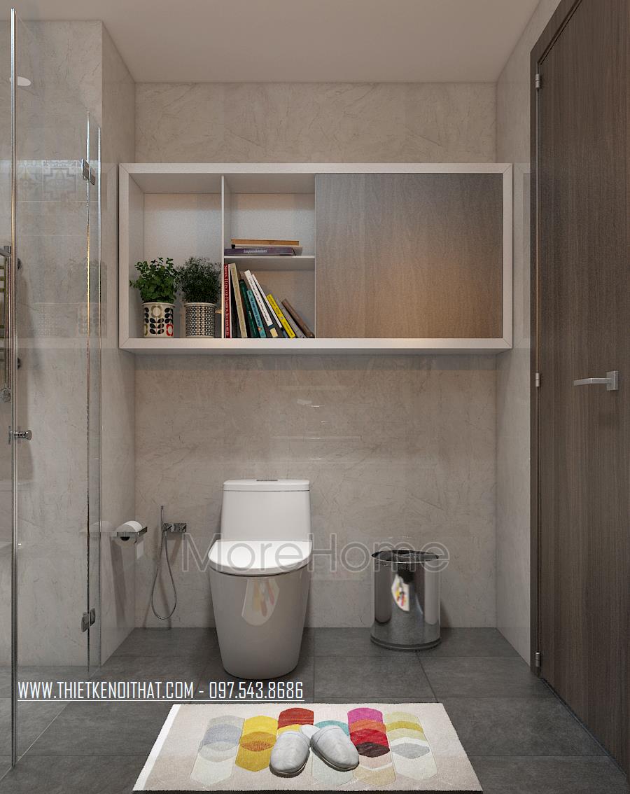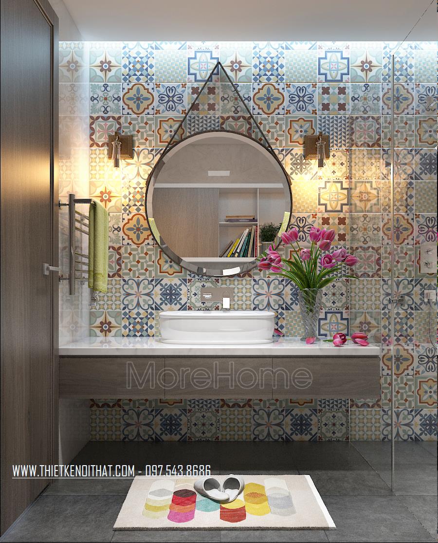 Cuối cùng là thiết kế nội thất nhà vệ sinh hiện đại. Gương và kính cường lực là các vật dụng nhẹ chủ yếu được kiến trúc sư tận dụng sử dụng trong căn phòng nhỏ này. Diện tích không quá rộng vì vậy các thiết kế cũng trong suốt từ đó tạo độ mở cho không gian và mang lại cảm giác cơi nới cho căn phòng hẹp. Tuy nhiên đá tự nhiên chưa đủ để tạo điểm nhấn, các tấm gạch nung với hoa văn ấn tượng được chính kiến trúc sư lựa chọn giúp mang lại cân bằng và kiểu cách cho không gian.
