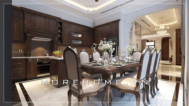 Mẫu bàn ăn gỗ tự nhiên tân cổ điển cao cấp và tiện nghi tạo không gian sang trọng và tinh tế cho nhà biệt thự