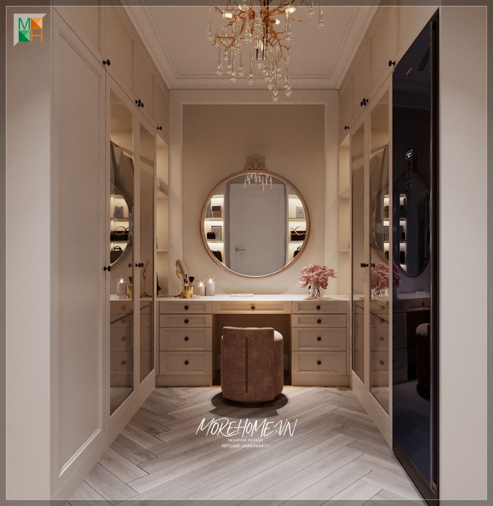 Hệ tủ áo phòng thay đồ hiện đại được thiết kế bằng gỗ công nghiệp kết hợp với cánh kính, phù hợp với phòng ngủ master có màu trắng.